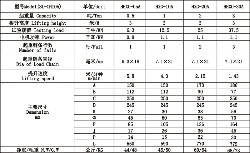 特点: 1、额定载荷1ton至3ton.3米的标准提升高度按钮2米按钮控制线。 2、电压389V/220V可选,三相或单相。 3、旋转的顶部和底部的吊钩配有安全钩卡。 4、可提供带接地的三孔插头易于安
